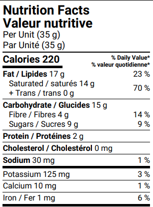 Ingredients: Coconut*, Agave*, Coconut butter*, Granola (gluten-free oats, sunflower oil, maple syrup*, sunflower seed*, flaxseed*, cinnamon*, vanilla extract*, sea salt*), 100% chocolate (*organic ingredients)